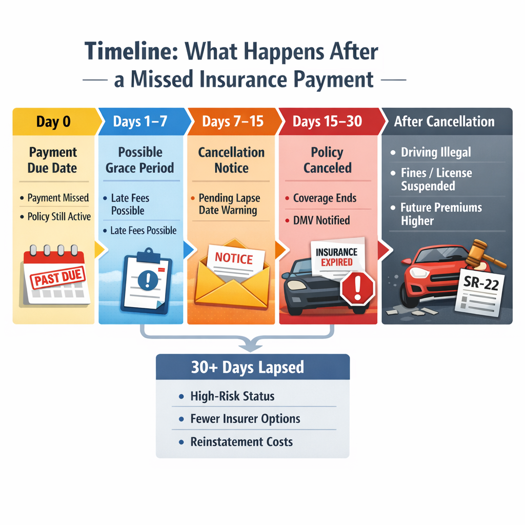Some insurers offer a short grace period — typically 7 to 30 days — if you miss a payment or your policy expires. However: