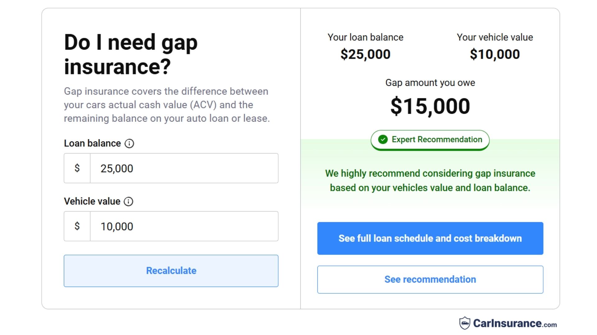 Compare your current loan balance to your car’s estimated market value using CarInsurance.com’s gap insurance calculator. If you owe significantly more than the vehicle is worth, especially during the first few years of ownership, when depreciation is steepest (often 10-20% in the first year alone), gap coverage is likely a smart choice.